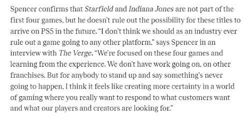 据The Verge报道,负责人菲尔·斯宾塞在接受采访时表示,虽然《星空》和《夺宝奇兵》不在名单之中,但不排除这些游戏将来登陆PS5的可能性。