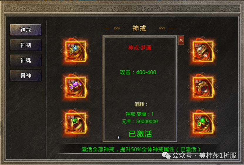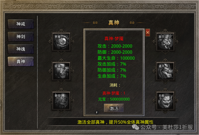 神武系统:总共有四种,每一种都能增加攻击,防御,生命数值,全部激活更有50%的属性提升!可以通过挂机获得所需的道具点!