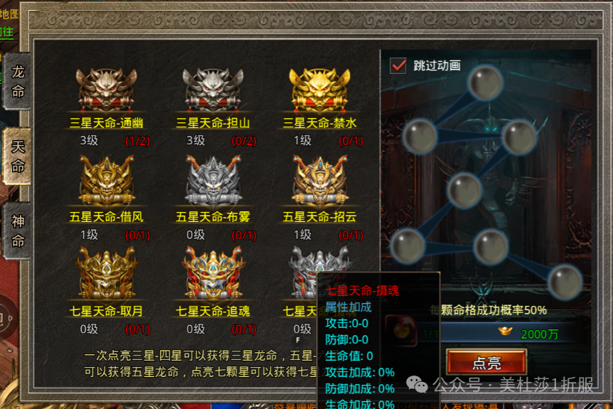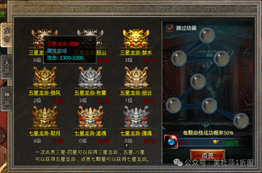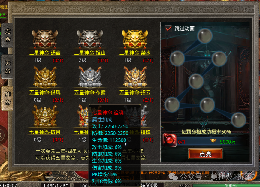 命格系统:总共有三种,升级所需要的道具为龙命精华,天命精华,神命精华!这个也是通过打怪挂机获得!