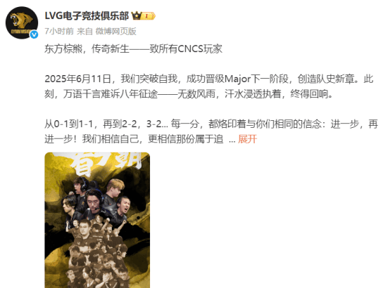 赛后,LVG俱乐部发文纪念,称东方棕熊,传奇新生。他们将会与所有CNCS战队并肩,接过旗帜,不断突破自我,击碎质疑!但我们深知,这不止是LVG的突破,更是CNCS书写传奇新篇的序章!