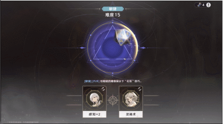 基础点数看专长,它有两个来源,其一是角色力量、智力、敏捷、感知、魅力五维属性(该属性只会影响剧情),属性本身会影响专长点数,如力量有破坏、决斗等合理延伸的专长,同时不同角色也会有特定专长,它们的数值叠加出“基础概率”,但基本不可能100%。