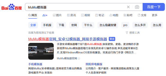 1、打开网页搜索“MuMu模拟器”,找准MuMu模拟器官网点击进入;