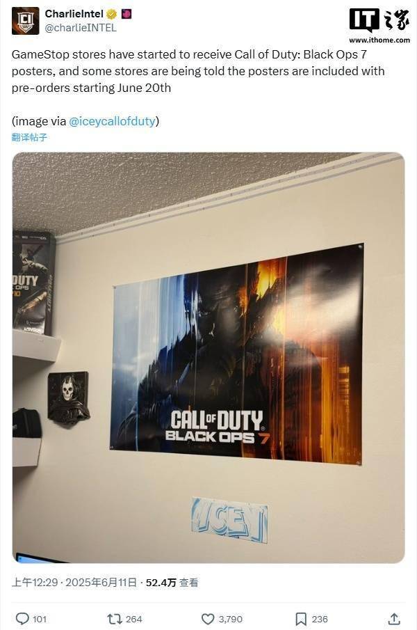 近日,据知名爆料账号CharlieIntel透露,GameStop游戏零售店已开始接收《使命召唤:黑色行动7》的宣传海报,并计划在6月20日起启动预订活动,凡预订该游戏的顾客均可获赠精美海报一张。