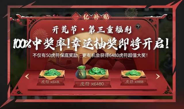 再也不是没中过奖的野人了!率土这波宠你一回,百分之百中奖率的幸运大抽奖!在达成特定条件后参与抽奖,人人都有50虎符保底奖励,还有机会获得6480虎符超值大奖哦!