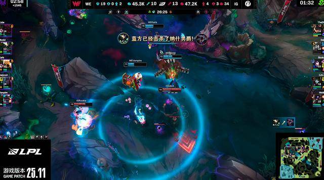 WE的女警换到中路,WE三线开始推塔运营,16分钟WE推掉IG中路一塔。WE在中上两路一直在推塔运营。Theshy豹女玩的是单带流,在边线推塔拉扯,而IG其他四人在正面只能缩到塔下。19分钟小龙团,IG将WE四人击杀,这波团战打完,WE前期取得的优势直接全部打空。
