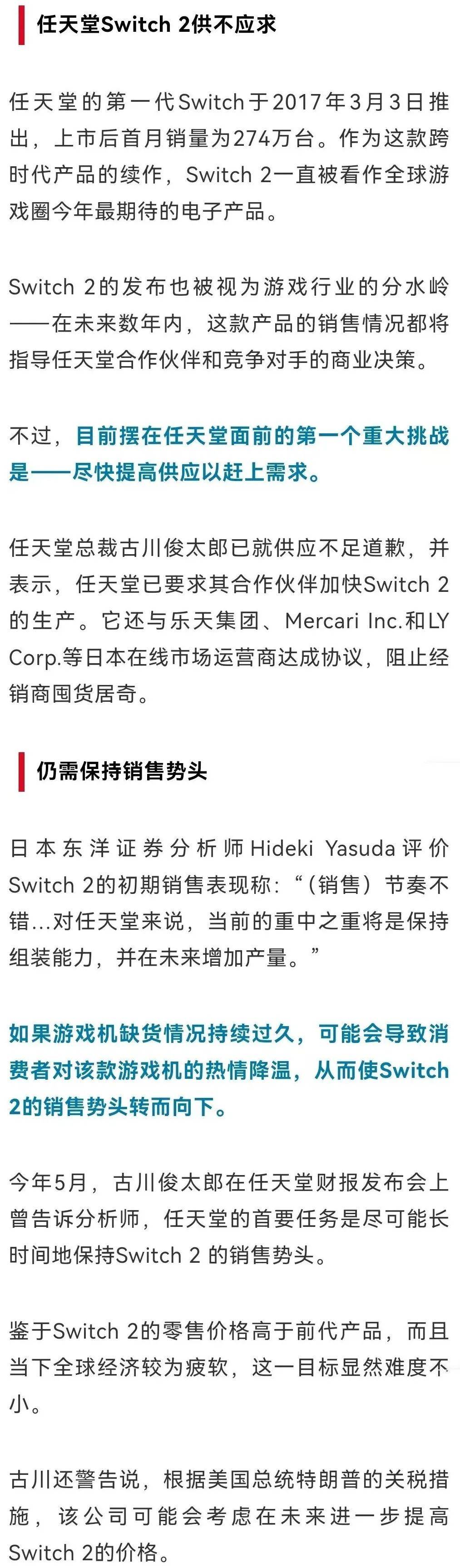 这预示着,任天堂原定的销售目标——2026财年(截至明年3月底)销售1500万台Switch 2将极有希望实现。该款游戏机供不应求的场景也强化了分析师的预测,即如果任天堂能够增加供应,其销量可能进一步大幅提高。