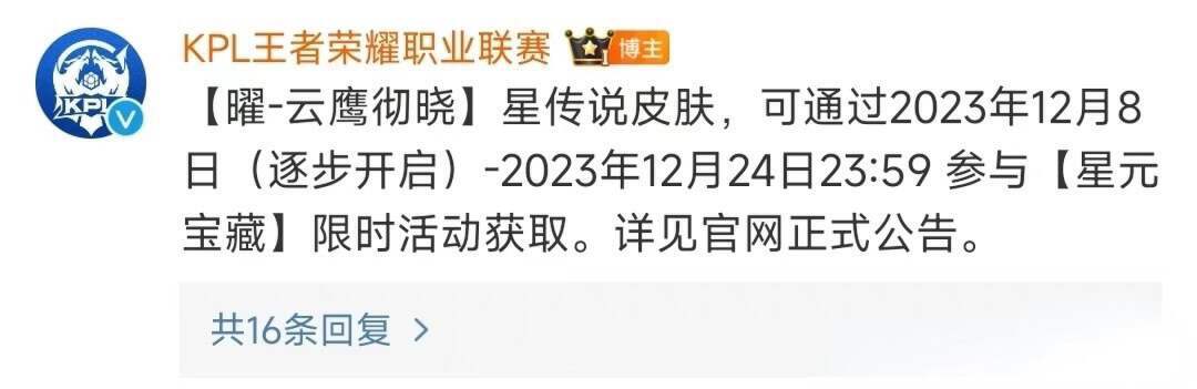 总体来说这款星传说的质量还行,中规中矩,用腻了云鹰飞将的话换成这款星传说也不错。不过相比较今年出的年限皮肤,即便是星传说也还是有所不如。这款星传说皮肤会在这个月24号上线,KPL王者荣耀职业联赛官方已经发布了公告,称在24号上线的星元宝藏中获取。目前还不清楚这个星元宝藏能不能用紫星币兑换,如果能用紫星币兑换的话,那还是非常值得入手的。