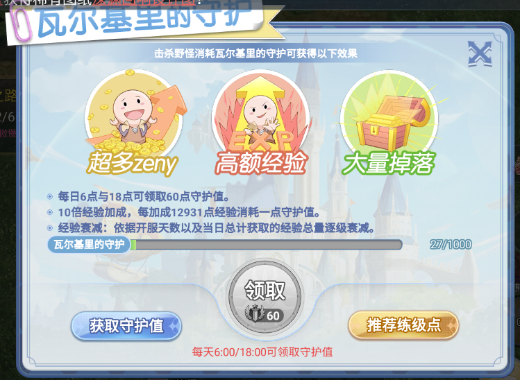 2.追赶经验会伴随着瓦尔基里的守护而增加,瓦尔基里的守护每天6点与18点可以领取60点守护值,当然也可以通过商城购买瓦尔基里的守护值。