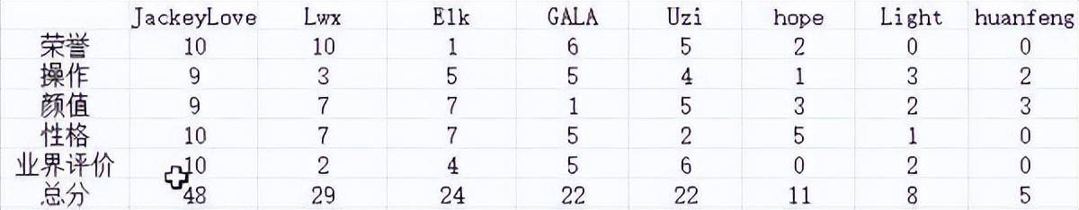 不过相比JKL高达48的总分,Lwx在发帖网友的打分评价中各项维度都要落后于阿水,虽然排名第二但是总分只有29分,和第一的阿水可以说有着不小的差距。而Elk、Gala分别位居第三和第四名,两人的总分则分别是24和22分,可以看出从第二到第四之间分差很接近,在发帖的这位网友的评价体系当中,Lwx和Elk、Gala是同一梯队的AD选手。