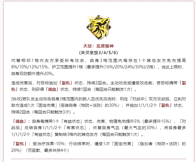 索引总结下来苍狼的这个天赋可绝对不是简单说说而已,其提供的效果数量之丰富,单个效果的强度之夸张......真是令人有些瞠目结舌,且这30%的免伤触发条件也不算苛刻,所以整个苍狼的防御能力是极为让人有预期值的,这也是为何维一会认为他强度不低的原因之一。