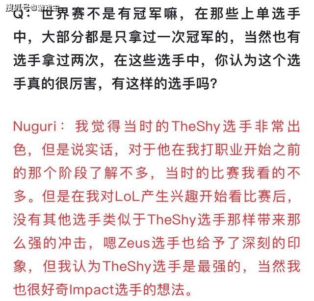这两年上单位置的排名变得越来越激烈,甚至有很多的人认为顶级上单的位置要有所调整。最近的韩媒采访中,nu guri也是给出了非常正面的回应,毕竟他是在lpl赛区和lck赛区都打过比赛的顶级上单选手。他觉得当时的TheShy选手非常出色,但是说实话,对于他在我打职业开始之前的那个阶段了解不多,当时的比赛我看的不多。但是在我对LoL产生兴趣开始看比赛后,没有其他选手类似于TheShy选手那样带来那么强的冲击,嗯Zeus选手也给予了深刻的印象,但我认为TheShy选手是最强的。