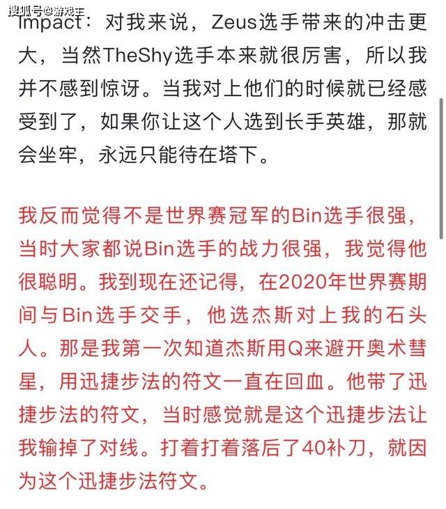 随后impact,也给出了自己的看法,在他看来不是世界赛冠军的Bin选手很强,当时大家都说Bin选手的战力很强,我觉得他很聪明。我到现在还记得,在2020年世界赛期间与Bin选手交手,他选杰斯对上我的石头人。那是我第一次知道杰斯用Q来避开奥术彗星,用迅捷步法的符文一直在回血。他带了迅捷步法的符文,当时感觉就是这个迅捷步法让我输掉了对线。打着打着落后了40补刀,就因为这个迅捷步法符文。