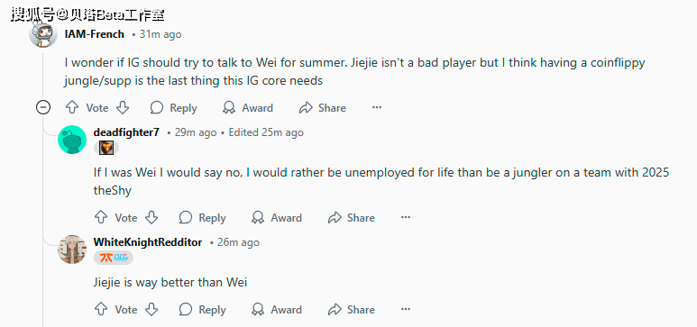 -我在想IG夏季赛是不是应该和Wei谈谈。Jiejie确实还不错,但我觉得IG的核心是不需要状态起伏不定的打野或辅助。