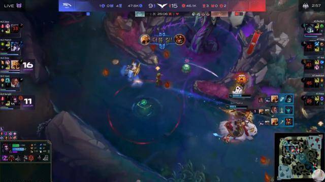 似乎是认为一定可以一波的情况下,Zeka的沙皇几乎没有走位被KT的辅助妮蔻单杀,结果导致拖到KT后续全部复活反团灭了HLE。因为现在门牙塔会复活的原因,所以HLE的后续偷家想法也是失败了。
