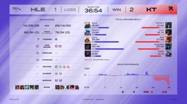 HLE在第二赛段首秀局输给GenG之后就再也没输过了,此前是取得了11连胜。而KT虽然前期上单换人导致成绩很差,但是在Perfect回归之后,最近也是取得了连胜。虽然很多人有想过KT能够赢一小局,但是万万没想到他们今天居然可以2-1击败HLE。尤其是第三局,双方上演了多次惊险刺激的相互一波的戏码,最终在第二条远古龙落入KT之手后,比赛才尘埃落定。