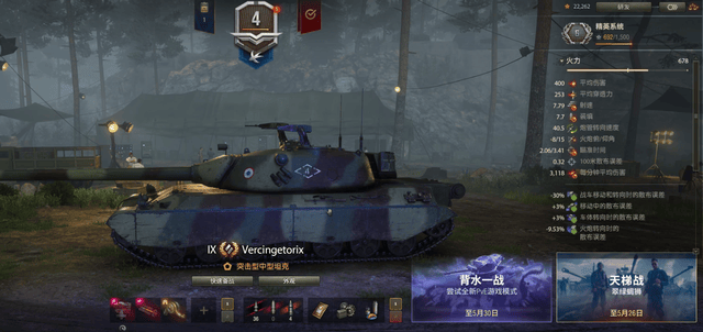 如果说MBT-B是暴力美学的代表,那么另一辆在究极空间折叠补给品中备受瞩目的F系IX级中型坦克——维钦托利,就是集火力、装甲与机动性三位一体的均衡代表。强度表现属于T1梯队。比较有意思的是,维钦托利拥有两种行驶模式,启动涡轮发动机模式时,输出功率可飙升至惊人的约1500马力,最大速度高达60千米/小时。在这种模式下,维钦托利能够迅速抢占地图上的关键战略点位,或是在战局不利时快速转场支援。