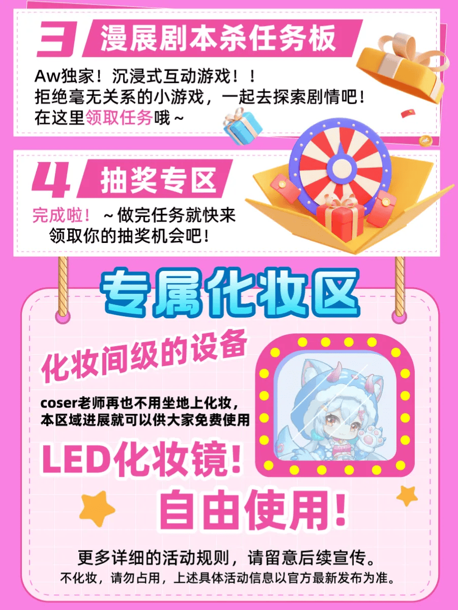 谷市街专区将展出海量正版周边,满足谷子控们的购物欲望。场馆内为游客提供了免费存包处、更衣室、化妆桌椅镜子、VIP休息区等。冒险家协会(服务台)为修复、医疗、补给处也将为游客提供全方位的服务保障。
