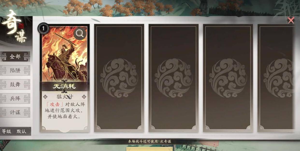 另外一个亮点则是在关卡中加入奇谋的设定,四大奇谋分为陷阱、鼓舞、兵阵、计谋四种,每个关卡中可以选择其中一种,每种都会对战局造成很大的影响,这很考验玩家奇谋的选择和释放时机,这是真回到三国当谋士了。