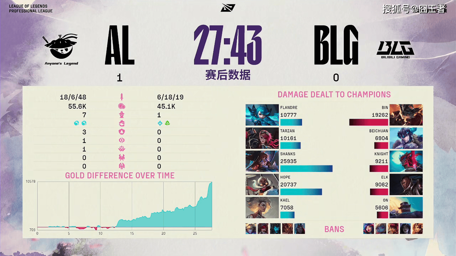 结果第一局比赛,两队仅前10分钟略作纠缠,后面的时间,就被AL打成了单方面的碾压局。6分钟左右,BLG率先抓到机会击杀Kael,随后控下第一条小龙;9分钟左右,Tarzan向死而生大招回锁,Shanks完美AOE打出1换2;12分钟左右,Kael完美开团配合Shanks击杀两人,北川拿下第二条小龙;15分钟左右,AL上野合力抓死Bin,随后利用人数优势拿下先锋;17分钟左右,Flandre完美切入位置连人带龙全部拿下,AL打出1换2;最终27分43秒,AL团灭BLG,先赢一局。