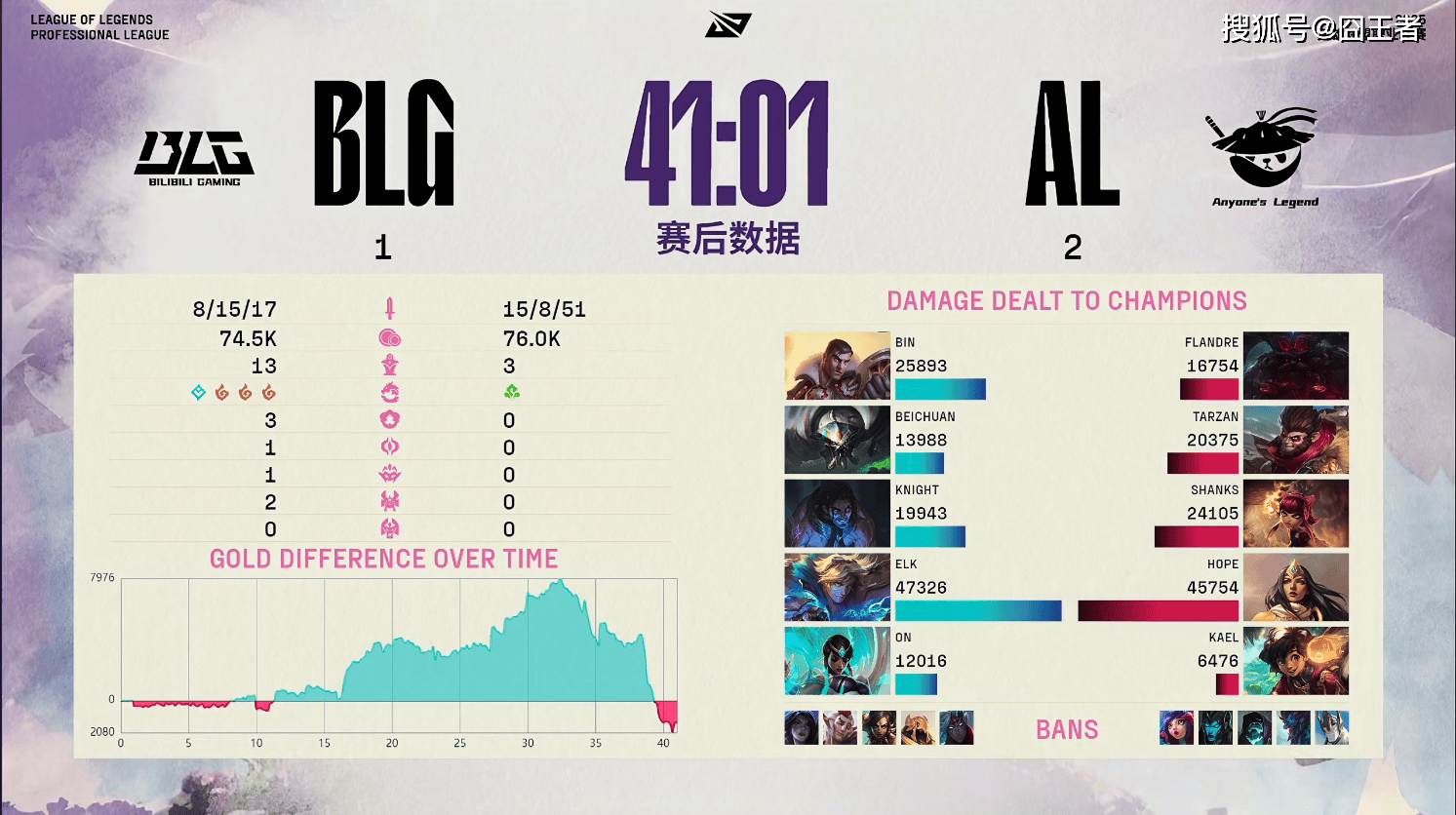 结果第二局比赛,BLG放弃唯一一次经济领先的机会,后续比赛被AL打成了碾压局啊。12分钟左右,AL先手击杀ON,随后北川关键控制BLG打出1换2;16分钟左右,BLG率先集火击杀Kael,塞恩及时开车支援AL打出1换2;17分钟左右,BLG强行拆塔付出代价,AL坚决反打完成0换3;19分钟左右,AL果断决策开龙开团,打出1换4后控下厄塔汗;22分钟左右,Shanks瑞兹抗住巨额伤害,AL再次打出完美1换4;26分钟左右,Shanks化身战神勇往直前,AL支援及时打出1换3;29分钟左右,Knight完美岩突阻止AL推进,Flandre支援及时打成3换3;31分钟左右,Knight与Elk关键发挥击杀Shanks,随后AL拿下听牌龙;最终38分整,AL团灭BLG,再赢一局。