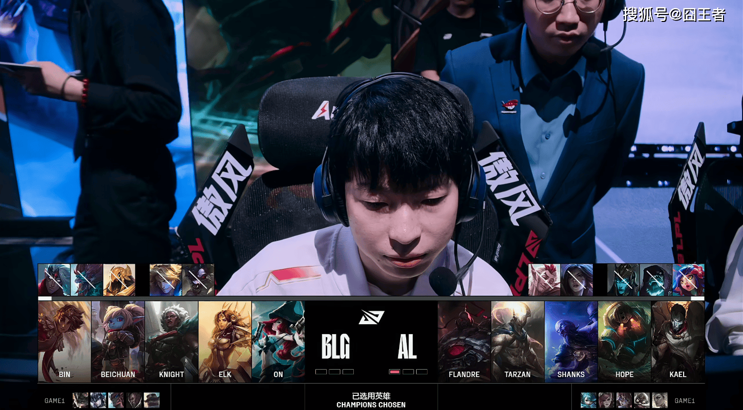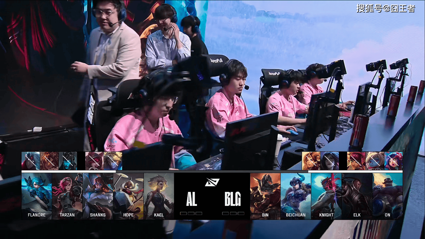 第一局比赛,AL蓝色方,禁用:韦鲁斯;岩雀;卡莉斯塔;霞;伊泽瑞尔,选用:Flandre格温;Tarzan蔚;Shanks阿萝拉;Hope飞机;Kael芮尔;BLG红色方,禁用:妮蔻;波比;安妮;卡莎;蕾欧娜,选用:Bin兰博;Beichuan猪妹;Knight永恩;Elk卢锡安;ON布隆