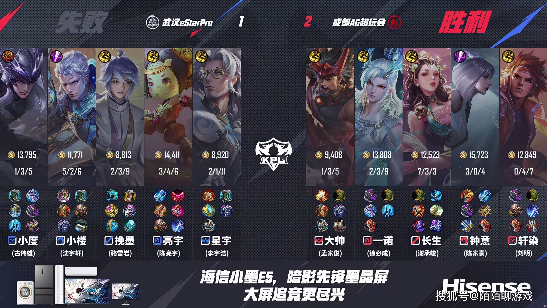 第二局,eStar抓住猫神的一次失误,不仅把劣势扳了回来,并且一鼓作气拿下了胜利,把比分扳平!第三局,猫神下,大帅上。3分钟,弈星大招控住孙策鲁班大师果断大闪配合队友击杀孙策拿下一血。4分钟,敖隐抓住机会单杀鲁班七号,AG超玩会顺势拿下暴君。15分钟,AG超玩会先夹击击杀鲁班七号后继续进攻,推掉对面上路一塔,但马超持续追击,击杀敖隐,最终双方3换3。18分钟,双方爆发团战,孙策从侧面入场关键控住鲁班七号,最终AG超玩会团战大获全胜,带着兵线压入水晶,率先抢到赛点!