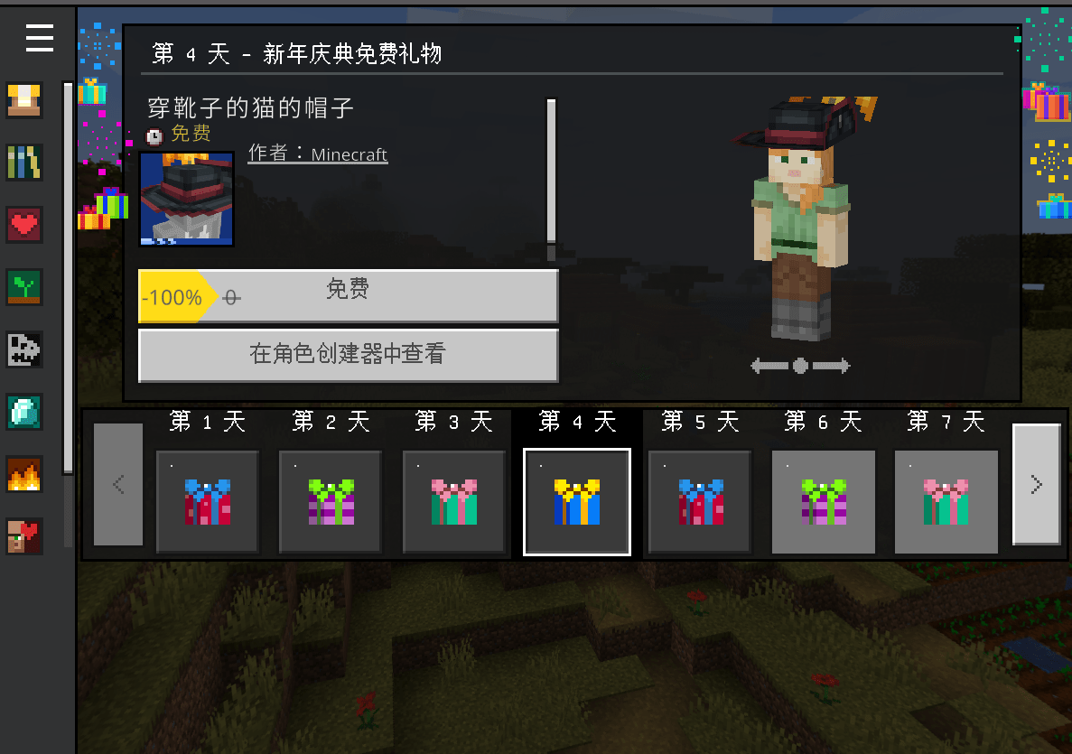2. Minecraft基岩版新年庆典活动;本周Minecraft基岩版市场中新年庆典活动已经开启,玩家每天进入都可以领取一个免费的礼物。截止目前已经发放到了第四天。第一天是一个光煞帽子(原译如此),第二天史瑞克头颅帽,第三天菲奥娜公主发帽,第四天穿靴子的猫的帽子。整个活动庆典将持续21天,玩家将会有21件免费的物品可以领取。