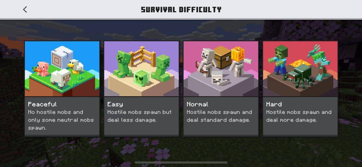 3. Minecraft基岩版新UI设计:Minecraft基岩版引入了更加容易区分的难度模型,让我们在选择Minecraft难度设置变得更加直观和容易。但问题在于,Minecraft基岩版至今还没有一个真正的类似JAVA版的极限模式玩法。