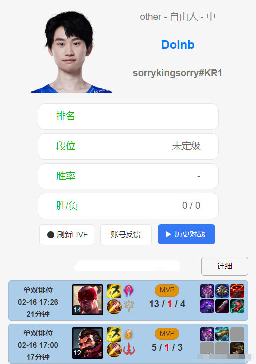 而之所以网友们发现是新一在使用这个账号,是因为当时他正开着直播,所使用的就是Doinb这个账号。只不过他打了两把之后就更换了账号,所以Doinb的韩服战绩显示只打了两局排位就没有更新了。在停播了超过三个月的情况下,最近还未曾露面的Doinb不知道能否如涵艺爆料的那样,在2月份回归直播间。