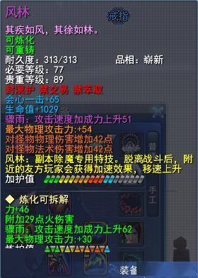 在装备方面,先刷齐两个69本试炼迷窟的戒指——风林。对于副本号来说,完美属性的五代大禹戒指比较难得,激活属性的随机性比较大,而完美的风林能提供数值不错的会心、骤雨、大攻和追攻属性,非常适合副本会心剑,所以在戒指上我选择了性价比较高的风林戒指。