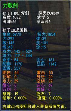 孩子装备的点化属性也通过浣灵玉露·肆和浣灵甘霖·肆提升到四条,可以在巫蛊副本商店和万相副本商店购买材料提升属性条数,然后就是用普通的玉露和甘霖洗出合适的属性。适合力敏弈剑的点化属性是力、附伤、大攻、诛心或明慧,如果在洗的过程中出了高数值的诛心或明慧,则优先保留。
