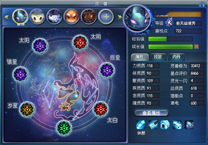 在灵兽的提升上,一方面是重新激活灵兽的资质。原来的灵兽虽然灵光一闪有13点很高,但是弈剑最需要的力敏资质都在105以下,所以需要用灵兽高级洗心石重新激活。现在力资质118和敏资质109,相比之前提升很大。