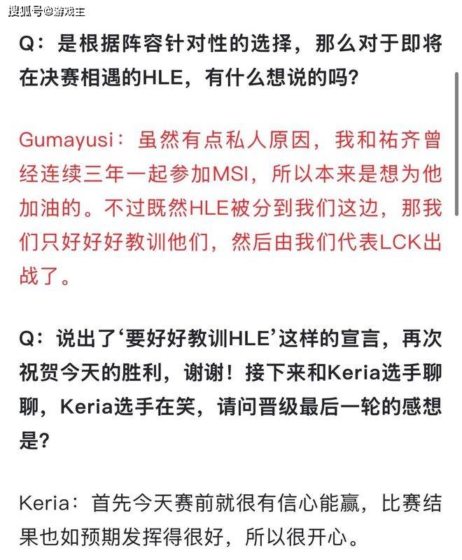 比赛结束之后,小吕布在赛后采访环节中也是非常的开心,直接谈到了hle战队,虽然有点私人原因,但是和zeus曾经连续三年参加msi,本来想为他加油的,不过既然hle被分到我们这边,那我们就只能好好教训他们了。看得出来,这是好朋友之间的玩笑话,今年T1战队和hle战队已经交手多次了,这一次的msi名额之争也会变得尤为重要,双方战队肯定会拼尽全力。