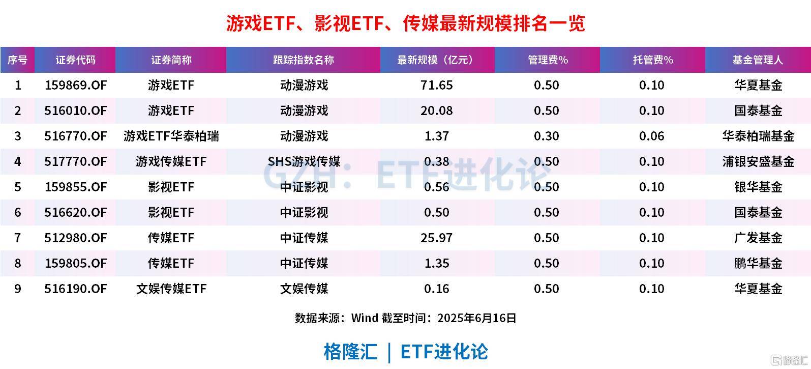 目前A股与传媒相关的ETF主要有游戏ETF、影视ETF和传媒ETF,其中华夏基金游戏ETF、国泰基金游戏ETF、游戏ETF华泰柏瑞分别是71.65亿元、20.08亿元和1.37亿元。