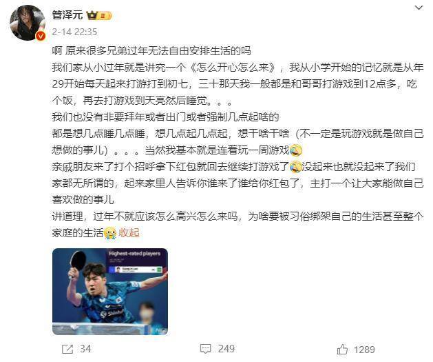 而对于拜年这种事,管泽元则表示:亲戚朋友来了,自己只是下去打个招呼,拿完红包就继续回去打游戏,根本不跟亲戚了扯闲话,如果自己没睡醒,家里人会收下红包,告诉自己谁来了,谁给发红包了。