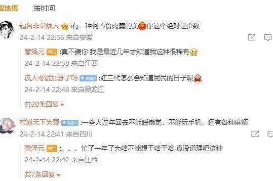比如就有网友说,管泽元这句话有点“何不食肉糜”的感觉,话说回来,越长大越觉得过年是一种负担,而没有开心的感觉了,过年期间并不轻松,太多人情世故让人身心俱疲,你们也有这样的感受吗?对此你们有什么想说的吗?