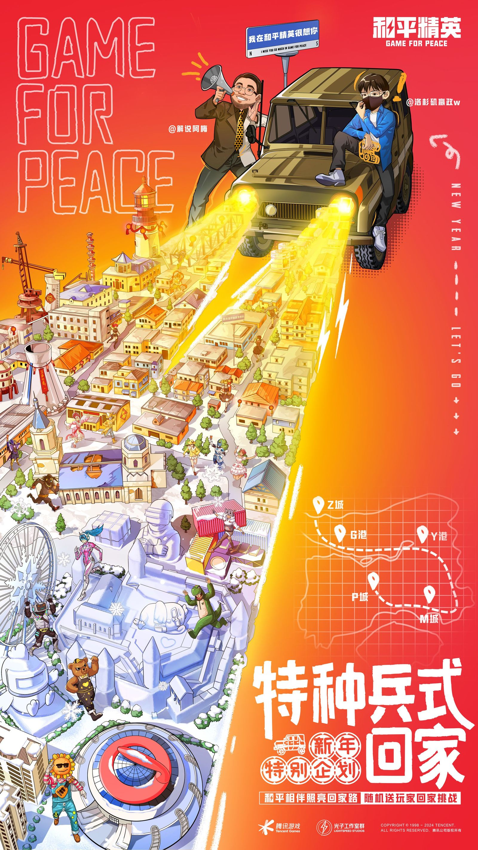同时结合游戏内的路牌,和平精英今年推出了龙年贺岁片《我在P城很想你》以及《G港友情岁月》、《爱不完的Z城》、《Y城麦田守望者》和《R城科目三》系列“回海岛的家”龙年玩家故事,告知玩家不论P城、Y城或者G港,都在等你回家过年!同时,23年传唱全国的《是妈妈是女儿》演唱者黄绮珊和希林娜依高再度携手为和平精英带来2024年春节回家主题曲《想念种在你的城》,温暖所有特种兵的回家路。