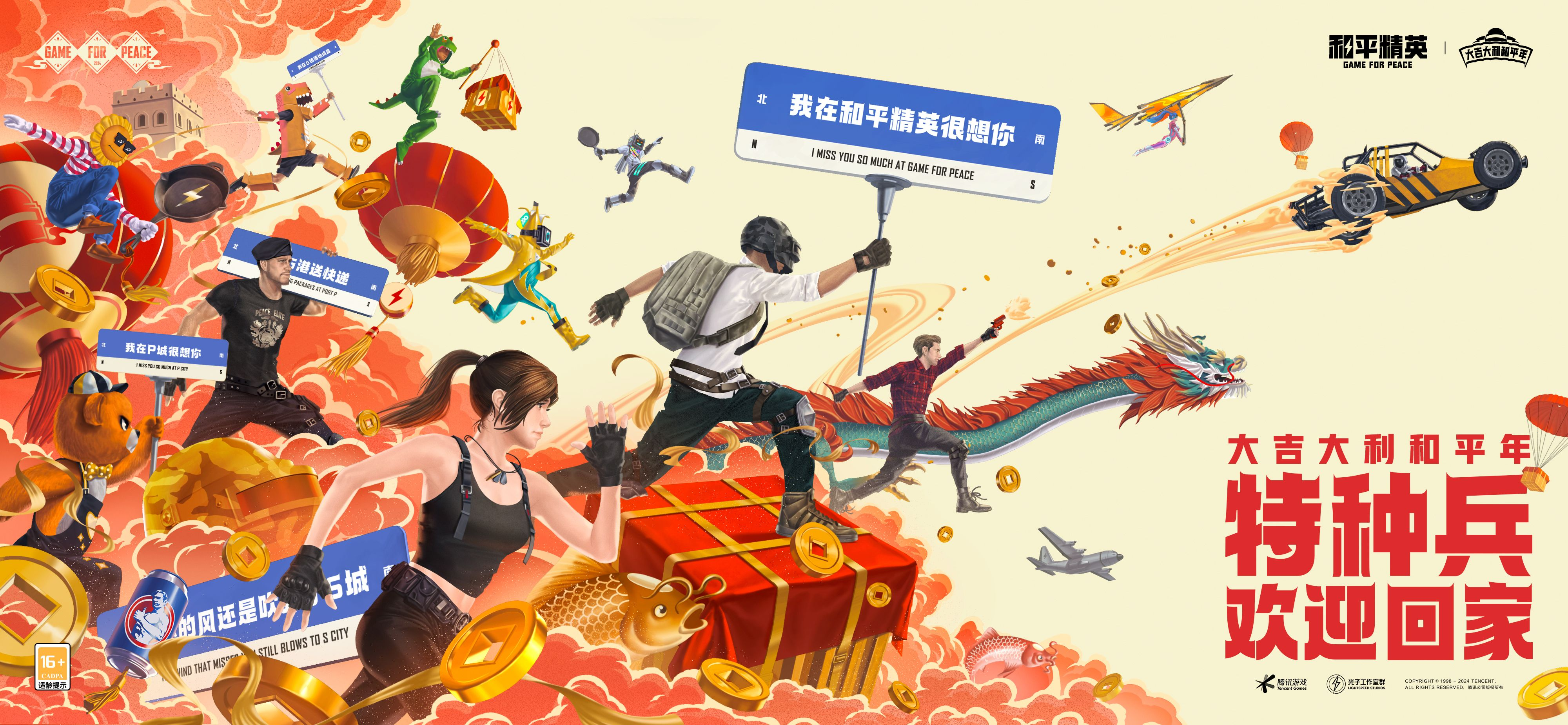 2024年龙年春节,和平精英不只推出了龙跃长城海岛主题新版本,还打造了「特种兵,欢迎回家!」的节点大事件,欢迎每位特种兵回到P城、S城、Y城等海岛的家。官方还为此推出满满的回家福利,既有和平精英主题的和谐号高铁专列送玩家回家,还在去哪儿平台安排了特种兵专属火车购票减免和抢票加速特权。主题海岛和超体对抗模式同步掉落空投雨,为玩家送上同程、去哪儿、高德地图、汉堡王、美团外卖等春节回家福利,共计送出福利券码数量超千万份。