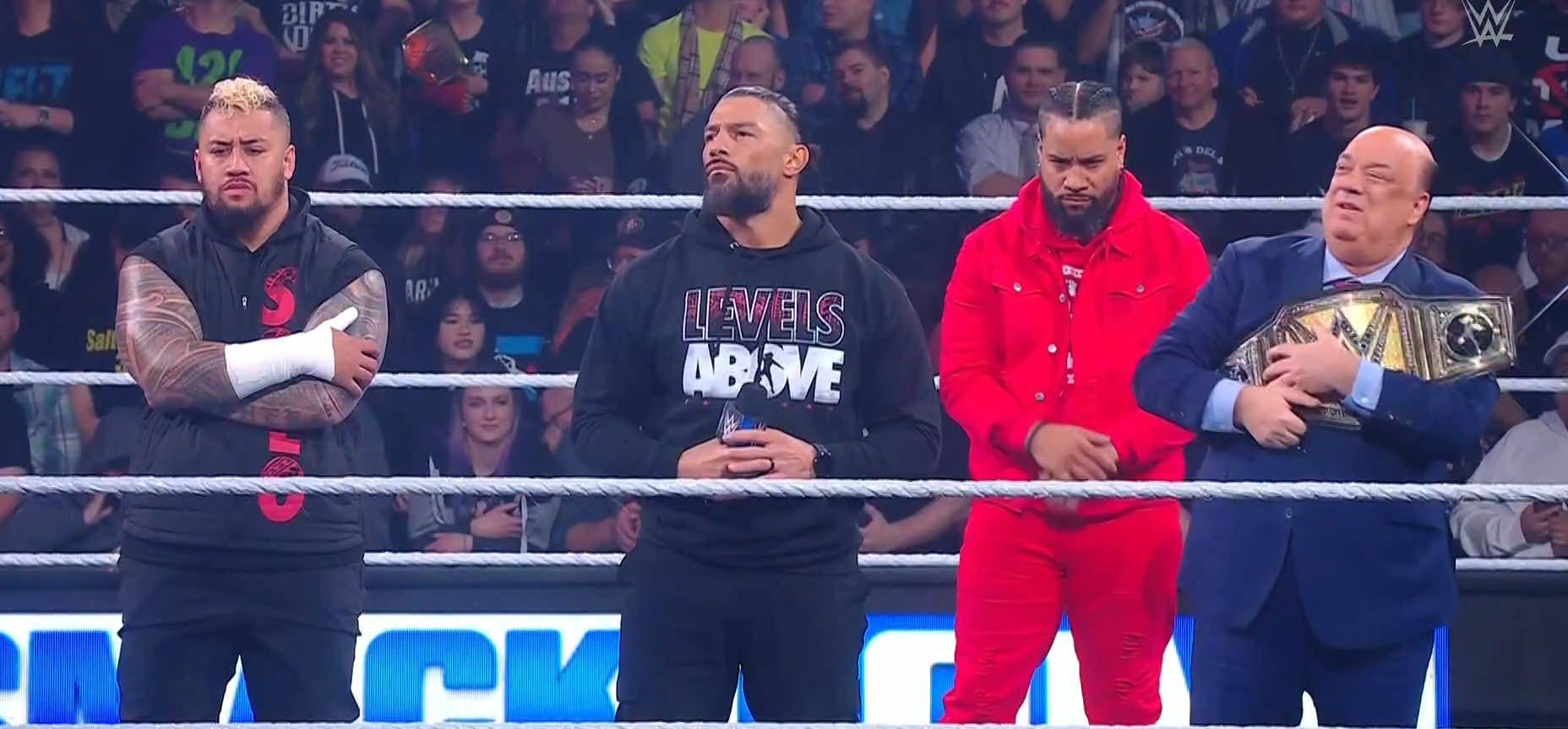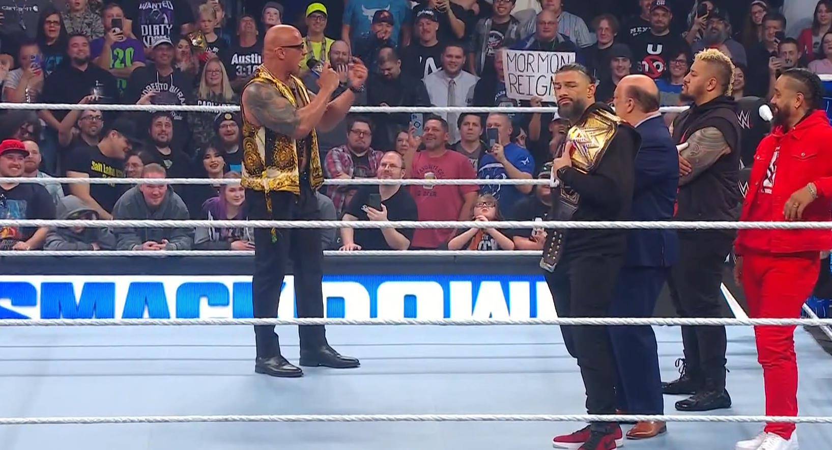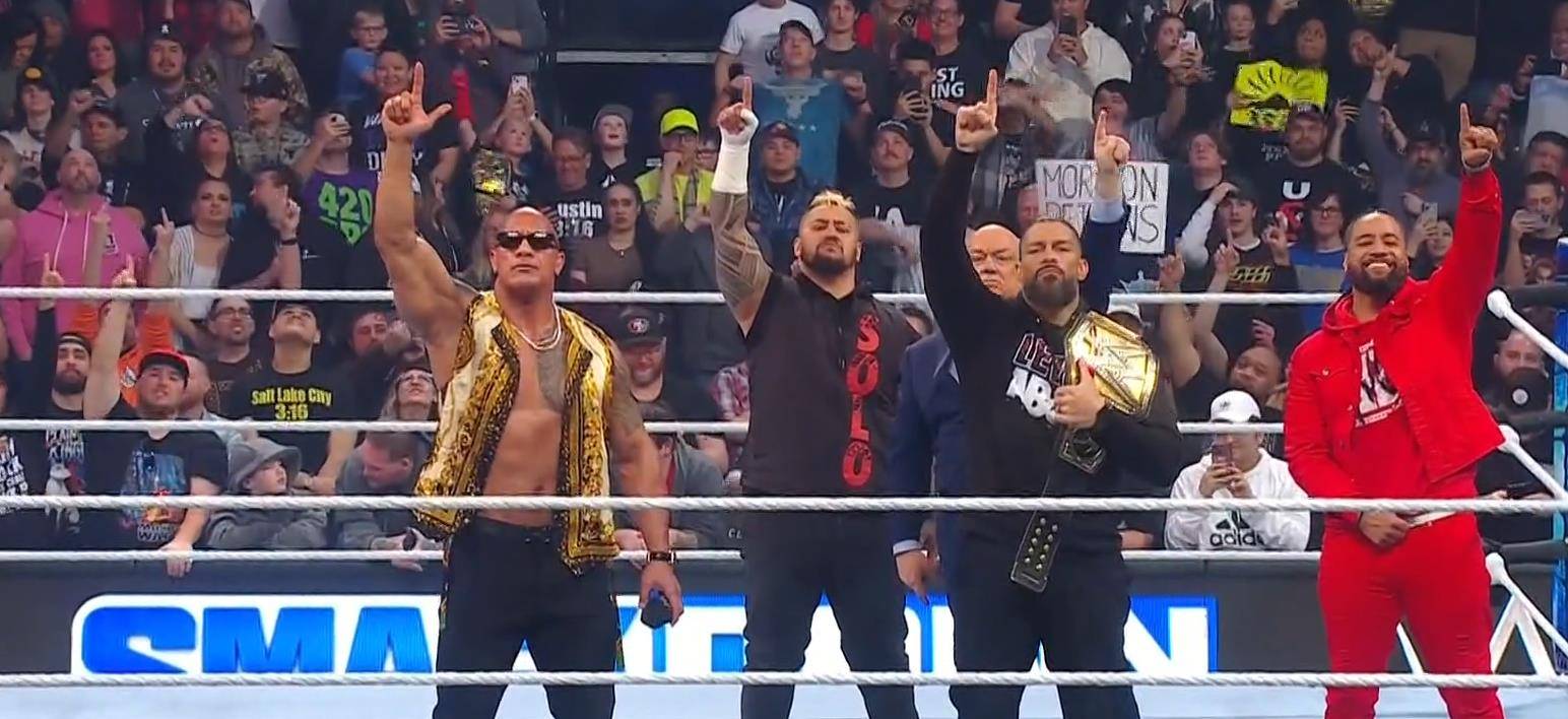 兄弟们,今天给大家带来了热辣辣的WWE SmackDown最新一期图文战报,这一期真是太震撼了!想想看,巨石强森 (Dwayne Johnson) 居然加入了血族 (The Bloodline),并且和罗曼·雷恩斯 (Roman Reigns)、吉米·乌索 (Jimmy Uso)、索洛·西科亚 (Solo Sikoa) 以及保罗·海曼 (Paul Heyman) 站在了一起,成为了一个更大更强的血统家族!