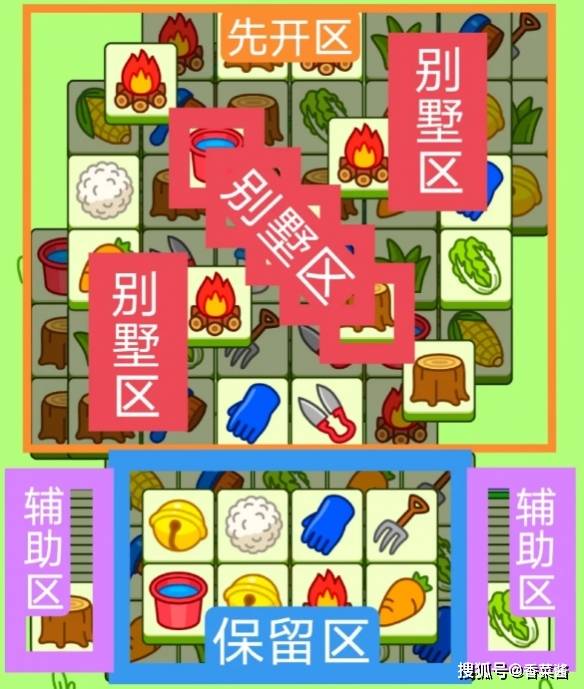 一个斜着的长型大别墅,两个一字型大别墅组成。开局先消除橙色区。然后按照一层层均匀消除表面牌。哪里压牌比较多就先消除。必要时用盲盒区辅助消除表面牌。尽量还是以别墅区内互相消除为生。蓝色区基本都是明牌。全部保留到后期使用。