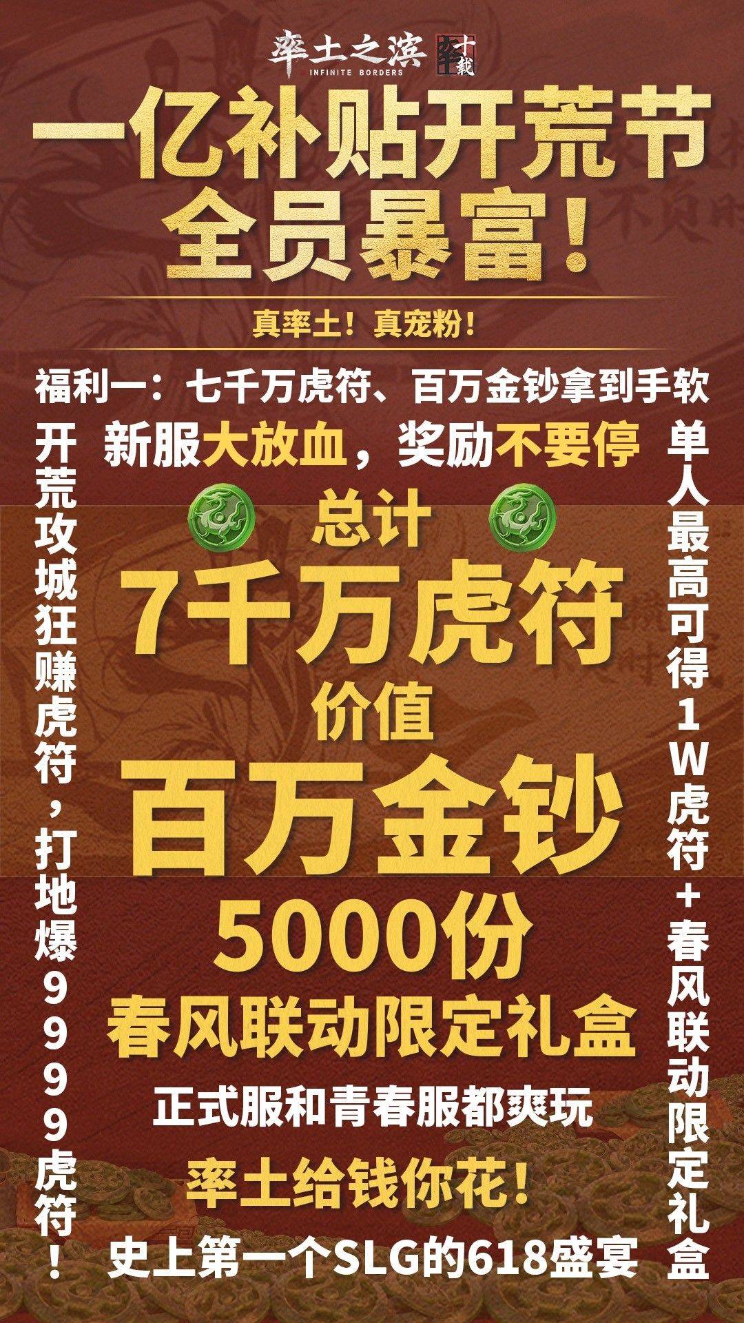 《率土之滨》在把友商打的晕头转向后,这个月又推出新动作,不过不是整玩家而是给玩家送福利,就是官方举办了游戏首届618开荒节,准备了价值一个亿的福利补贴给玩家!