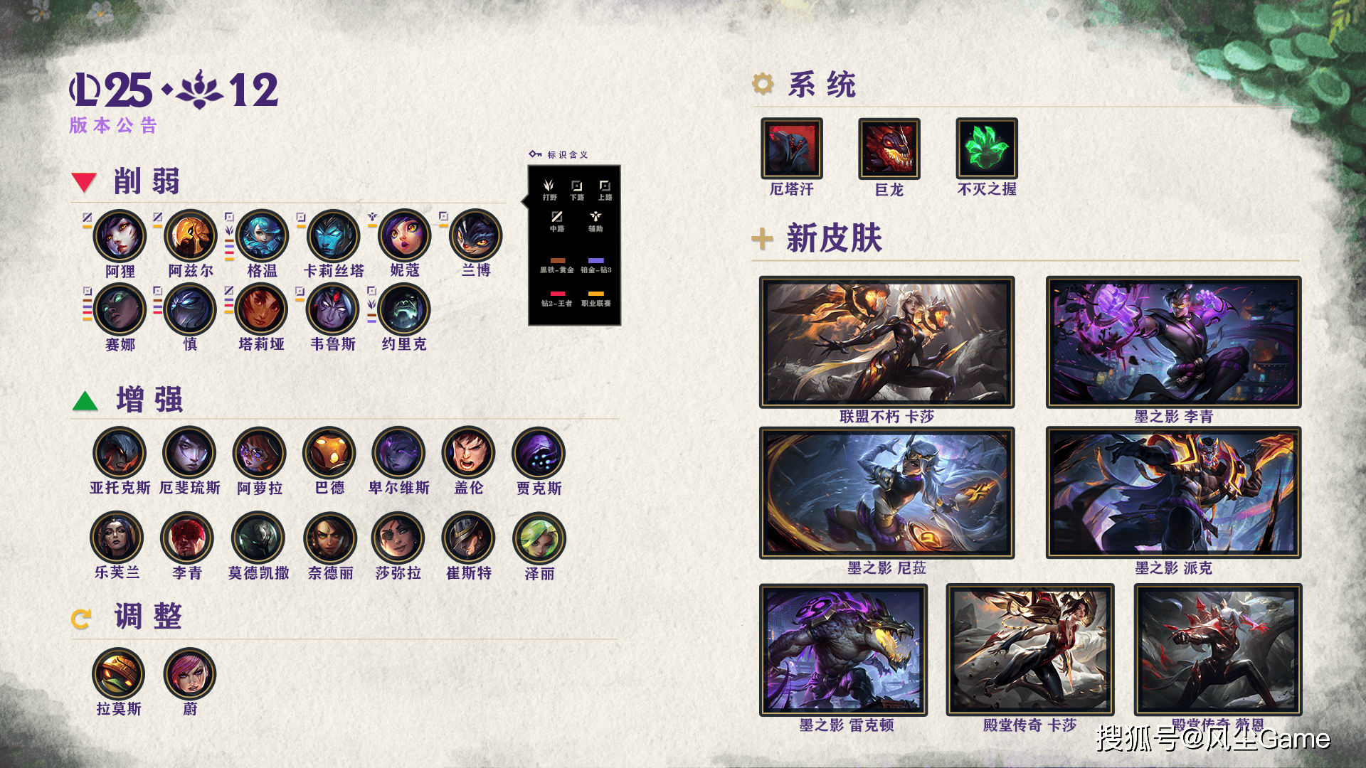 中路的瑞兹、卡牌,两大支援型英雄,同时被削弱,野区的蔚,也被砍了一刀,单看这一个版本,其实还看不出什么东西,咱们得结合25.12版本分析,在目前版本里,拳头已经把赛场热门英雄,都削弱过一遍了,沙皇、岩雀、狐狸三大中单,同时被砍,妖姬、兔子精,是得到加强的。