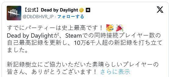 Behaviour Interactive今天宣布,旗下经典非対称恐怖多人求生战斗竞技游戏《黎明杀机》刷新Steam同时在线玩家数历史记录,达到10.6万人。