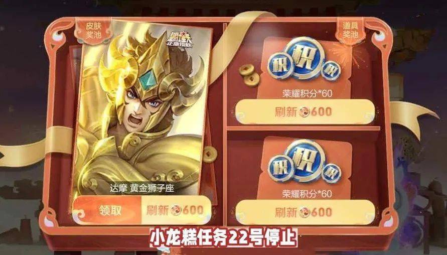 其一是灵宝市集,小龙糕的收集任务在21号正式结束,也就是说玩家还有3天的时间收集小龙糕刷新奖励,还未刷出传说皮肤的小伙伴记得继续做任务刷新。同时除了皮肤外,剩余两张道具卡也在22号之后开放领取,比如刷到138限时点券或200荣耀积分的小伙伴还得耐心等待!