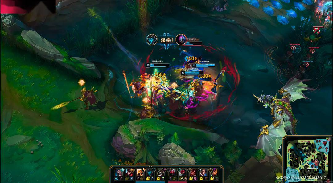 UP打野赵信开局卡视野Gank中路,将Rookie慧的闪现打了出来。这让Rookie前期处于对线的劣势,UP打野赵信继续中上游走,维护住上半野区的优势。NIP下路在开局与打野越塔拿到一血之后,对线2v2反被UP找到机会,打出对位击杀。