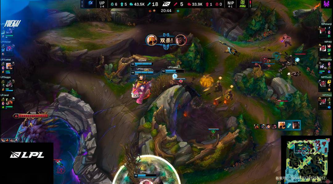 打到14分钟,两队都将下路两人换到上路爆发团战,UP的赵信犹如赵云附体,直接摧毁NIP的后排,随后1分钟UP纳尔在下路塔下直接将NIP三人击杀,UP这一波直接将NIP的中下两路外塔全部拆除。