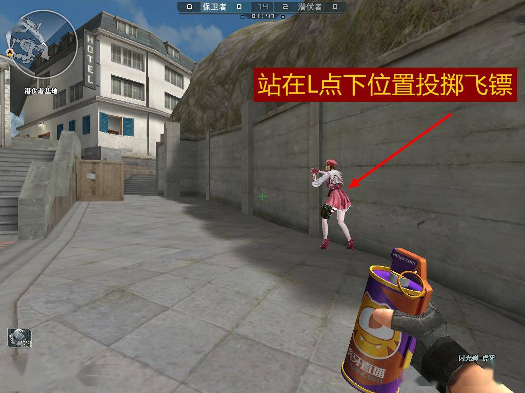 如上图所示,作为潜伏者的我们开局后可以来到L点下位置,这个位置我们可以既不暴露自己的身位,又可以投掷飞镖击杀府邸敌人。