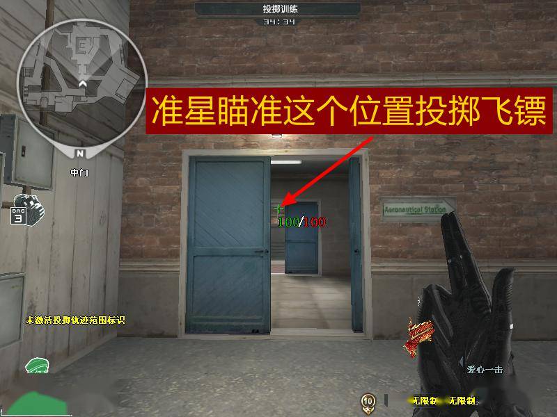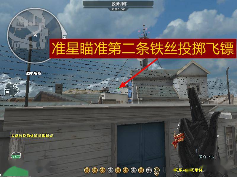 如上图所示,将我们的准星瞄准从下往上数的第二条铁丝,接着不需要任何助跑动作,直接投掷飞镖即可。