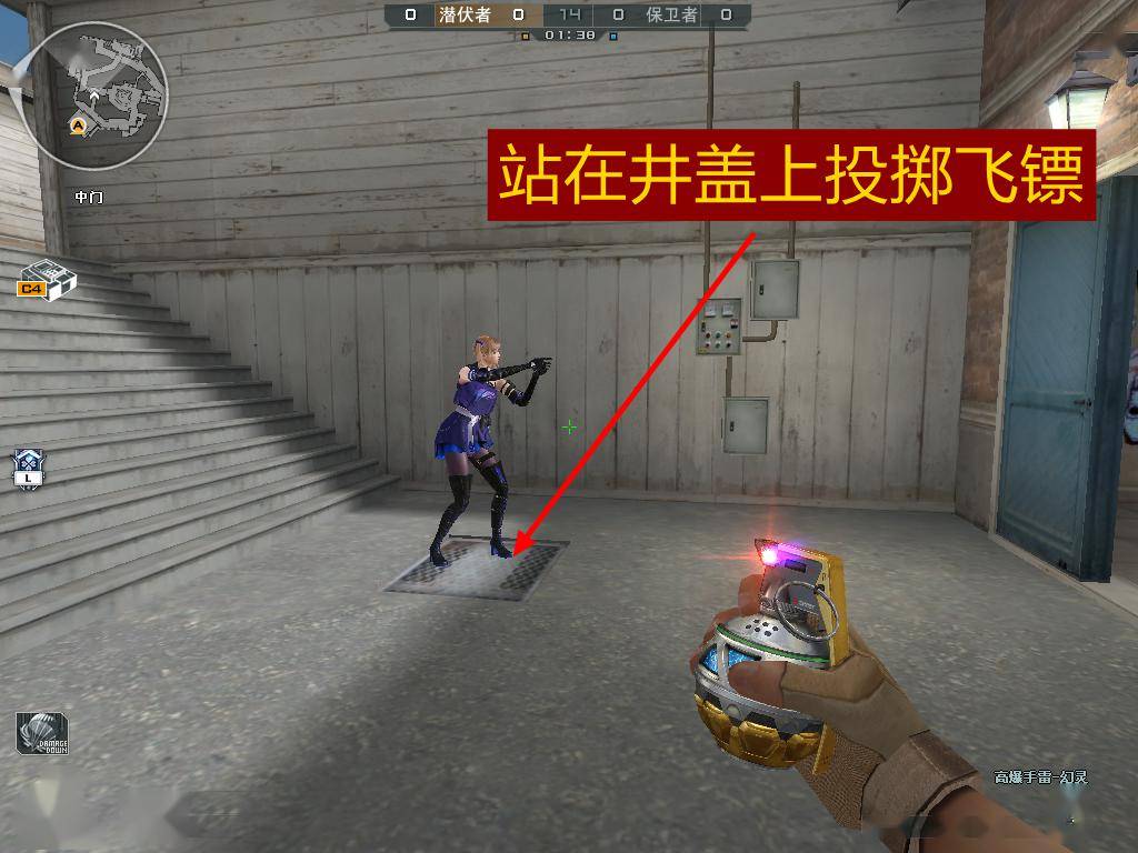 而潜伏者也学会了如何反针对。但作为保卫者的我们如果选择投掷飞镖的话,潜伏者就无法反针对我们了。如上图所示,我们可以开局后站在井盖位置投掷飞镖。
