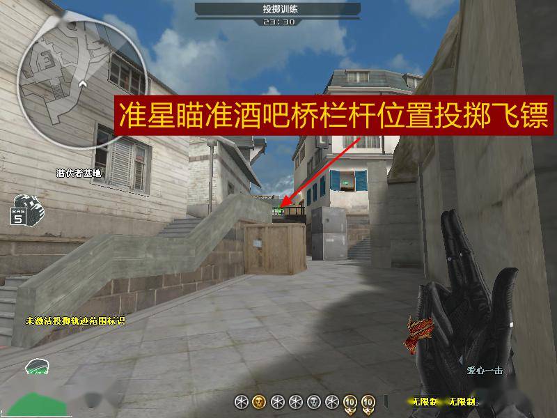如上图所示,将准星瞄准酒吧桥栏杆位置,接着直接投掷飞镖即可。